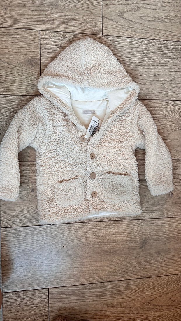 Etiketli Kapüşonlu ve bol kesim bej renk çocuk montu, kalın yumuşak ve sıcak peluş kumaştan üretilmiştir. Ön cepler ve düğmelerle sade bir sokak stili sunar.