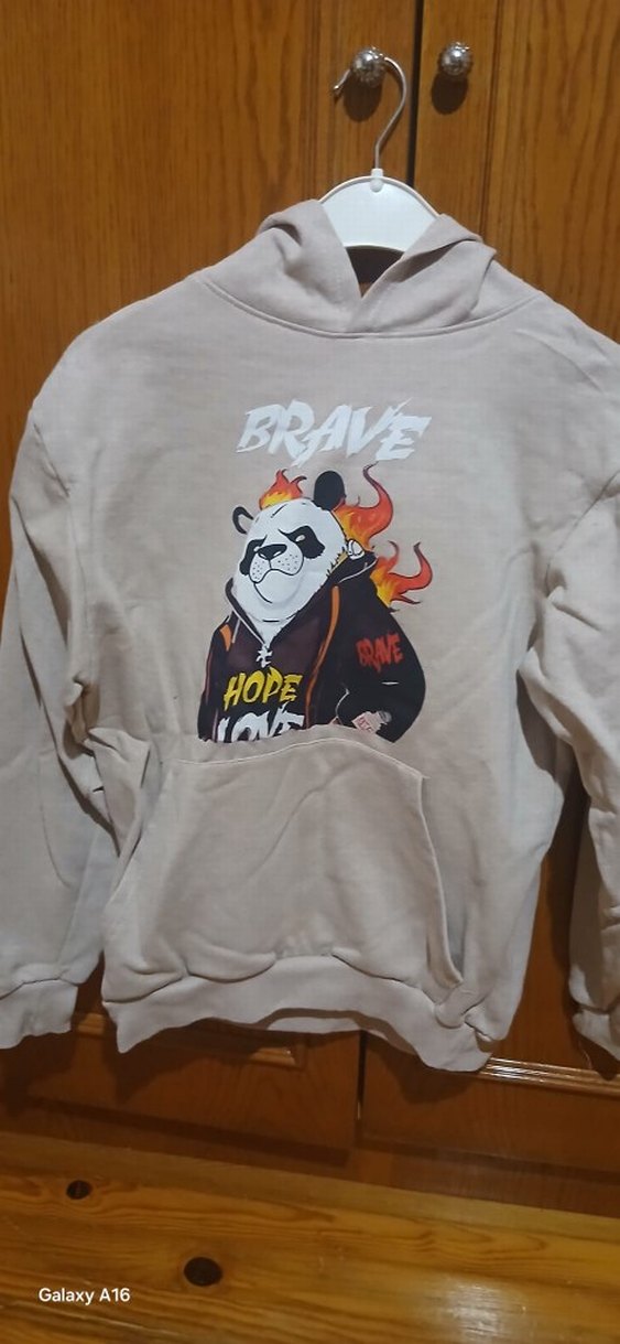Yumuşak polar kumaştan, kapüşonlu, uzun kollu bej erkek sweatshirt. Üzerinde alevler ve 'HOPE' ile 'BRAVE' yazılı panda baskısı bulunur.