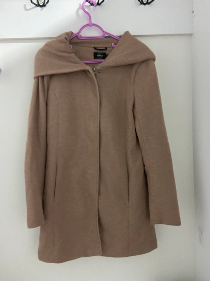 Kapüşonlu, uzun kollu ve önü kapamalı bej kaban. Kumaşı yumuşak ve sıcak tutar.
