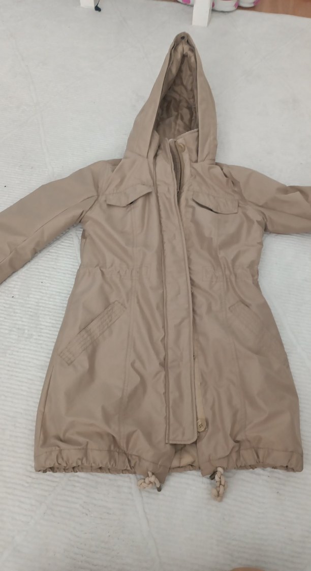 Kapüşonlu, fermuarlı, uzun kollu, bej renkli kadın ceketi. Düz ve sade tasarımıyla dış mekan kullanımı için uygundur. Rahat kesim ve orta boy uzunlukta.