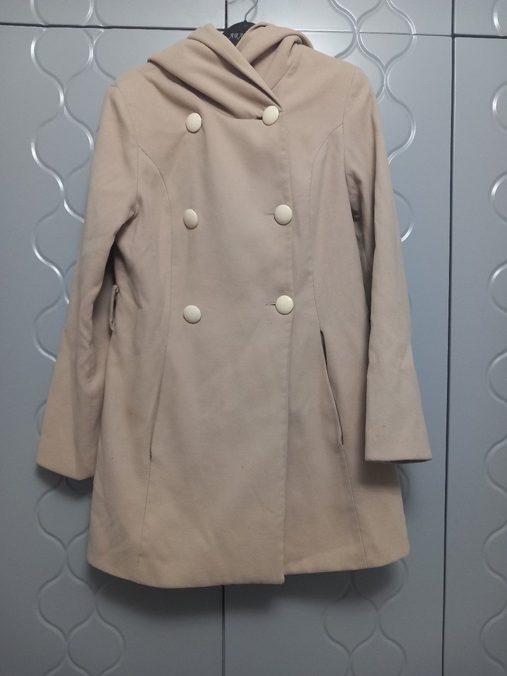 Kapüşonlu ve çift düğmeli bej kadın kaban, yan ceplidir ve yumuşak, sıcak bir kumaştan yapılmıştır.