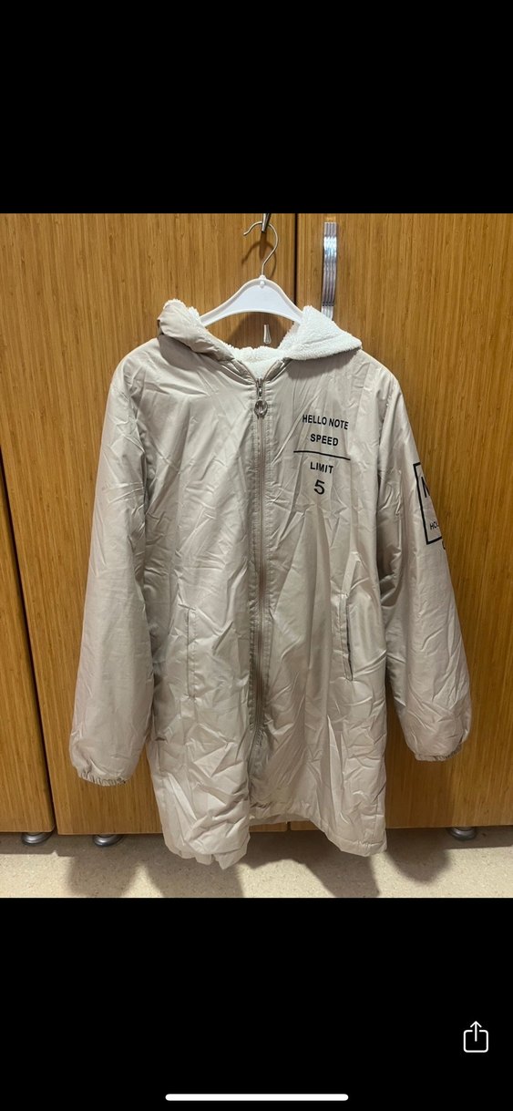 Kapüşonlu, fermuarlı, uzun kollu bej renk kadın midi ceket. Rahat kesimli ve 'NOTE' baskılı, yumuşak ve sıcak bir kumaştan üretilmiştir.