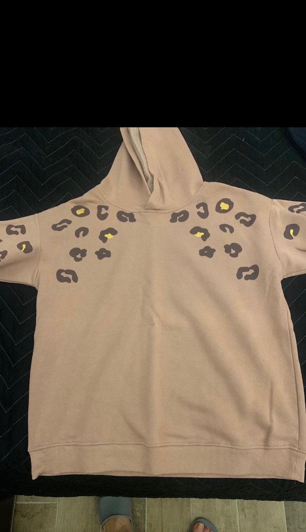 Kapüşonlu, uzun kollu, bol kesim bej sweatshirt. Üzerinde baskılı desenler ve yumuşak kumaş bulunur. Kürk detaylarıyla rahat bir kullanım sunar.