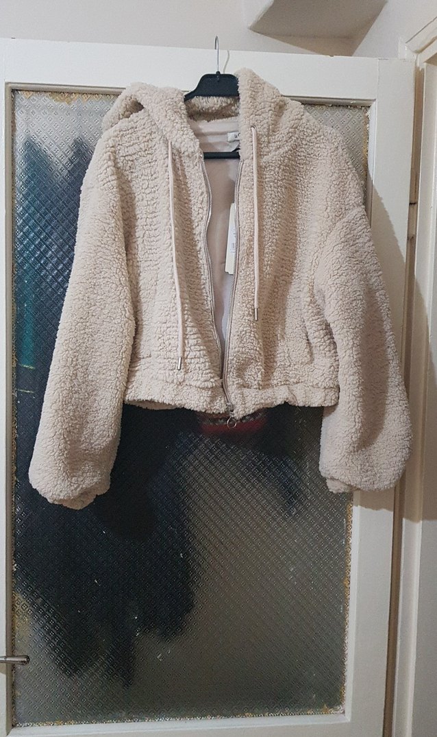 Bej renkte, kapüşonlu, peluş detaylı yumuşak dokulu, bol kesim ve uzun kollu kısa boy ceket. Desensiz ve rahat sokak stili için uygun.