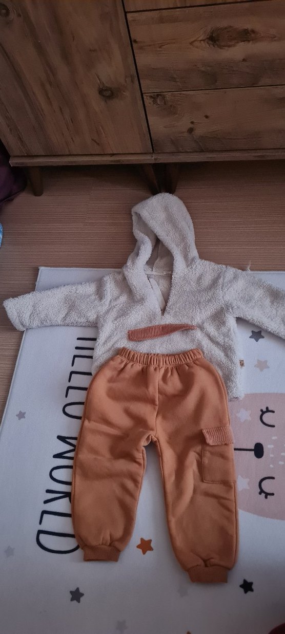 Kapüşonlu, örgü uzun kollu bej üst ve cepli yumuşak turuncu pantolondan oluşan sıcak ve rahat bebek takımı. Hiç kullanılmadı.