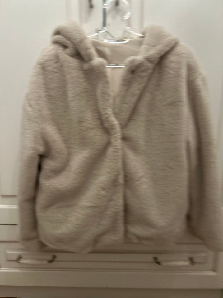Kapüşonlu, uzun kollu bej kadın ceket, yumuşak peluş kumaştan ve kürk detaylıdır. Salaş kesim ve midi boydadır, günlük sokak stili için uygundur.