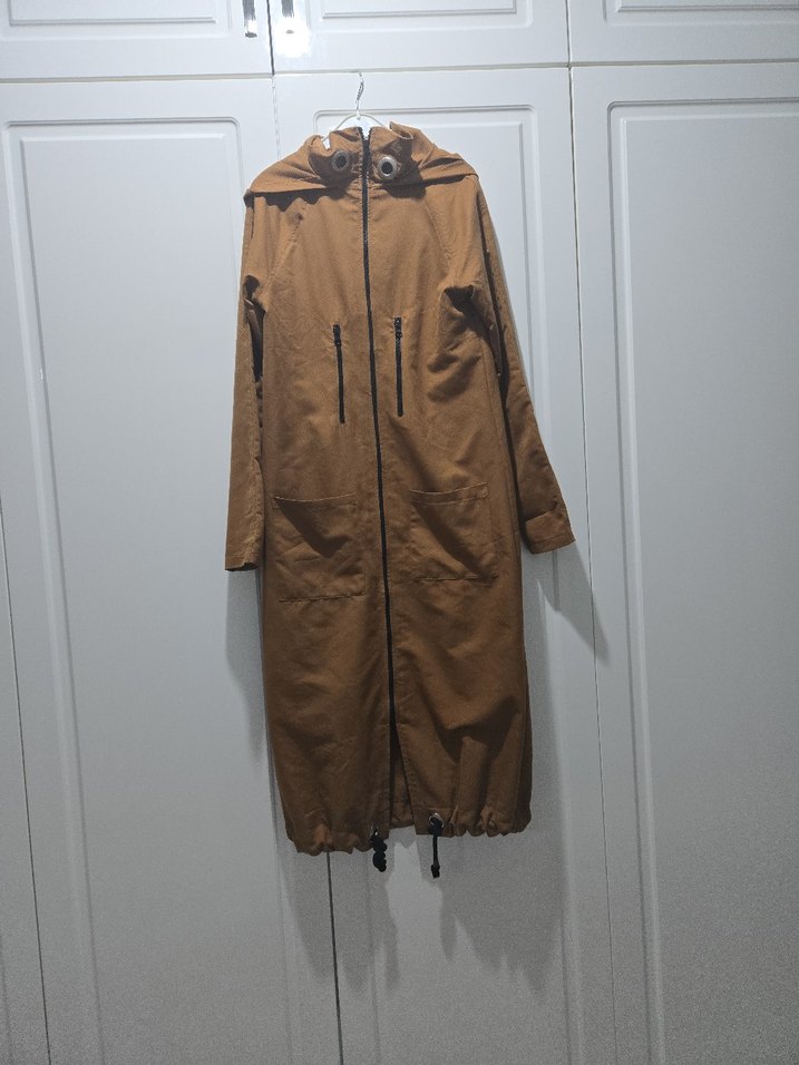 Kapüşonlu, fermuarlı cepleri olan bej süet uzun parka. Salaş kesim ve sokak stiline uygun, uzun kollu ve desensiz tasarım. Günlük kullanıma uygun.
