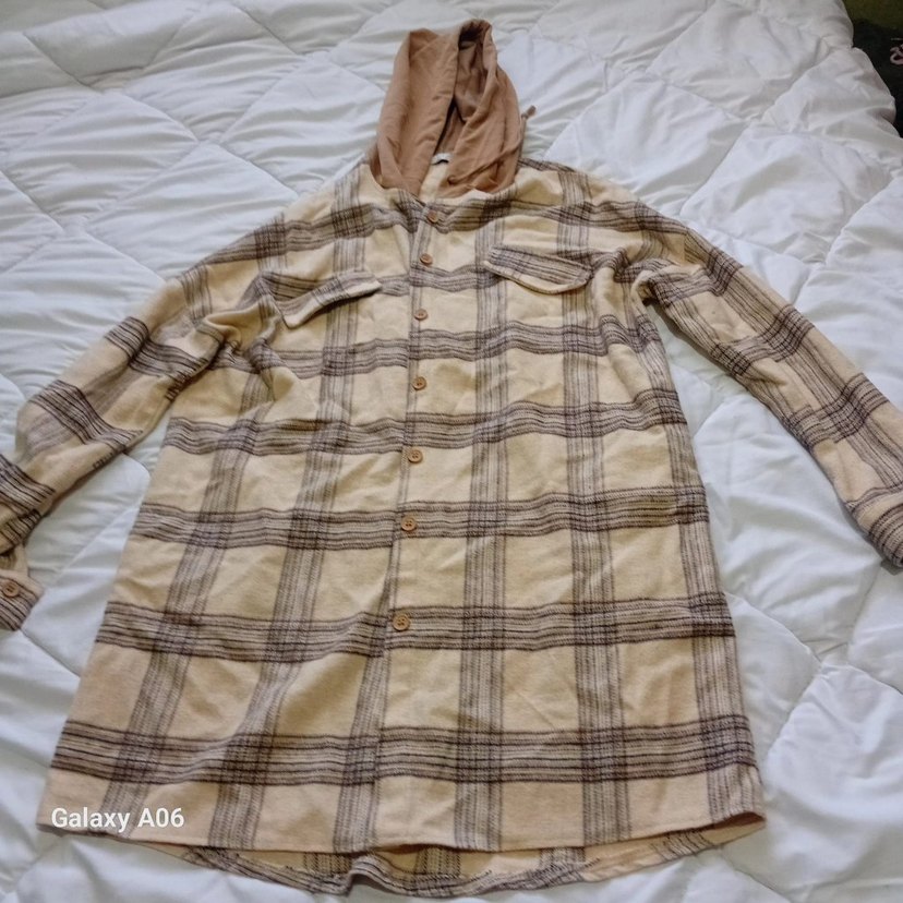 Kapüşonlu, düğmeli ve bol kesimli uzun bej kadın gömleği. Yumuşak keten kumaştan üretilmiştir, günlük kullanım için uygundur.