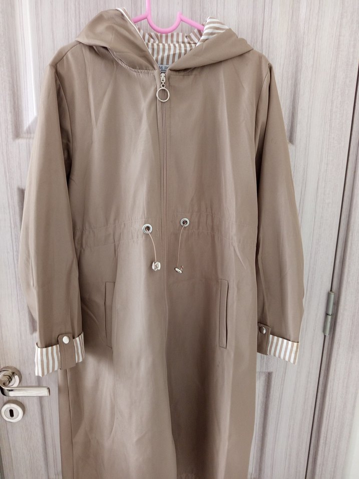 Bej uzun kadın trençkot, kapüşonlu ve belden ayarlanabilir ipli, bol kesimdir. Uzun kollu, düğmeli manşetli ve ceplidir. Düz, sentetik kumaştan üretilmiştir.