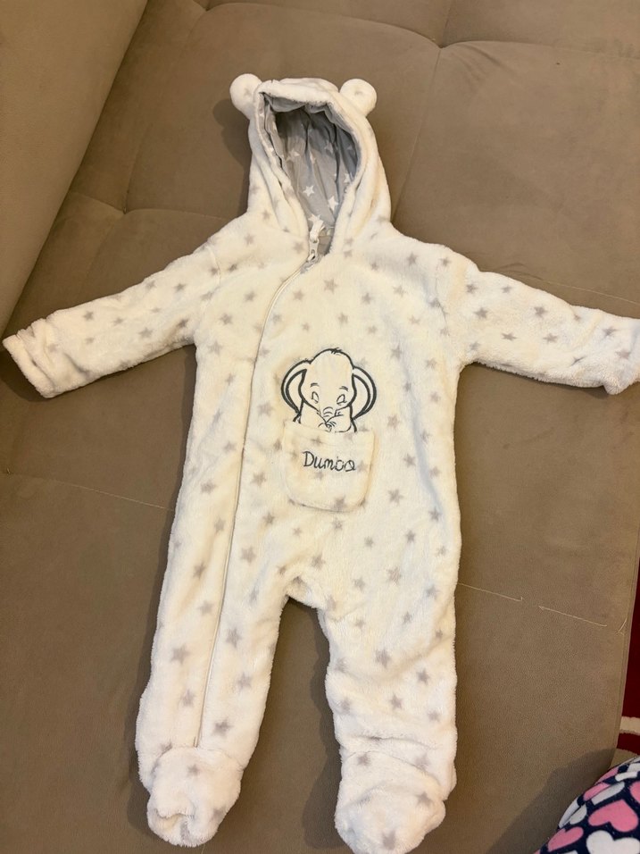 Kapüşonlu ve ayıcık kulaklı beyaz bebek tulumu, yıldız desenli ve kürk detaylıdır. Önünde Dumbo baskılı cep bulunur. Sıcak tutar. ❄️