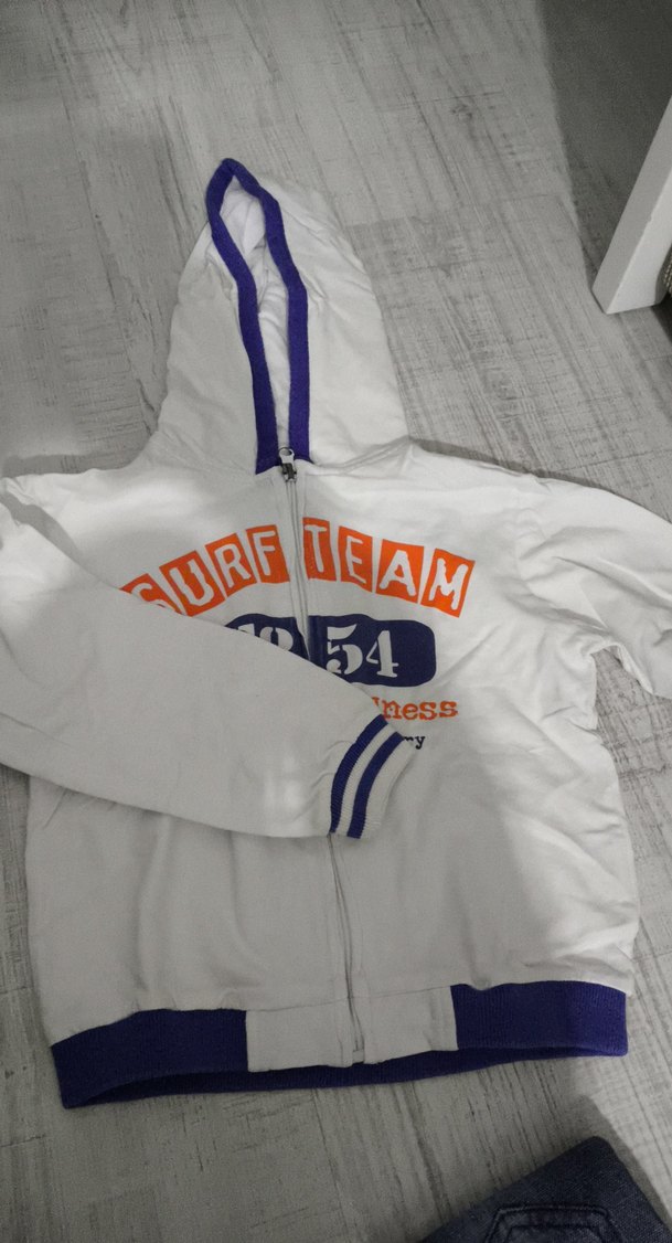 Kapüşonlu ve fermuarlı beyaz erkek çocuk ceketi, baskılı desenlere ve yumuşak tüylü kumaşa sahiptir. Gri ve mavi detaylarla trend görünüm sunar.