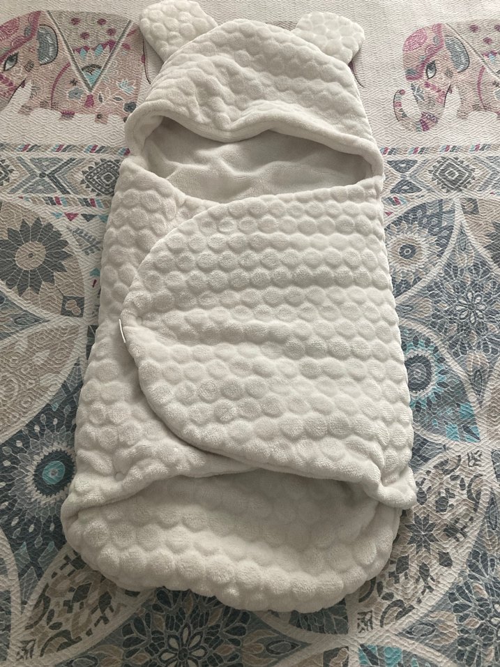 Kapüşonlu, kabartmalı desene sahip yumuşak beyaz bebek battaniyesi. Küçük kulak detaylarıyla sevimli bir görünüm sunar.