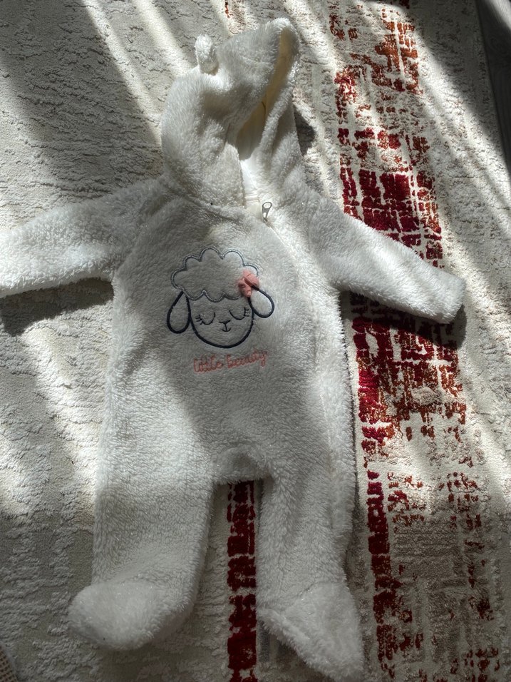 Kapüşonlu ve kürklü detaylara sahip beyaz bebek tulumu, önünde işlenmiş kuzu deseni bulunur. Yumuşak dokusuyla sıcak tutar.