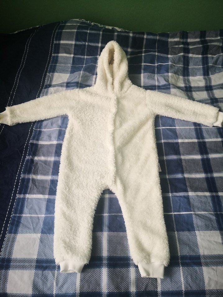 Kapüşonlu, yumuşak ve sıcak kumaştan beyaz bebek tulumu, kürk detaylı ve sade tasarımlı. Sokak stili için uygun. ❄️
