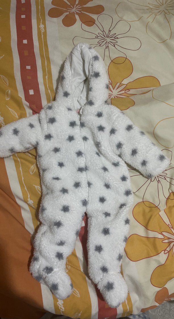 Kapüşonlu, beyaz zemin üzerinde gri yıldız desenli, yumuşak kürk detaylı bebek tulumu. Bebekleri sıcak tutar. ❄️