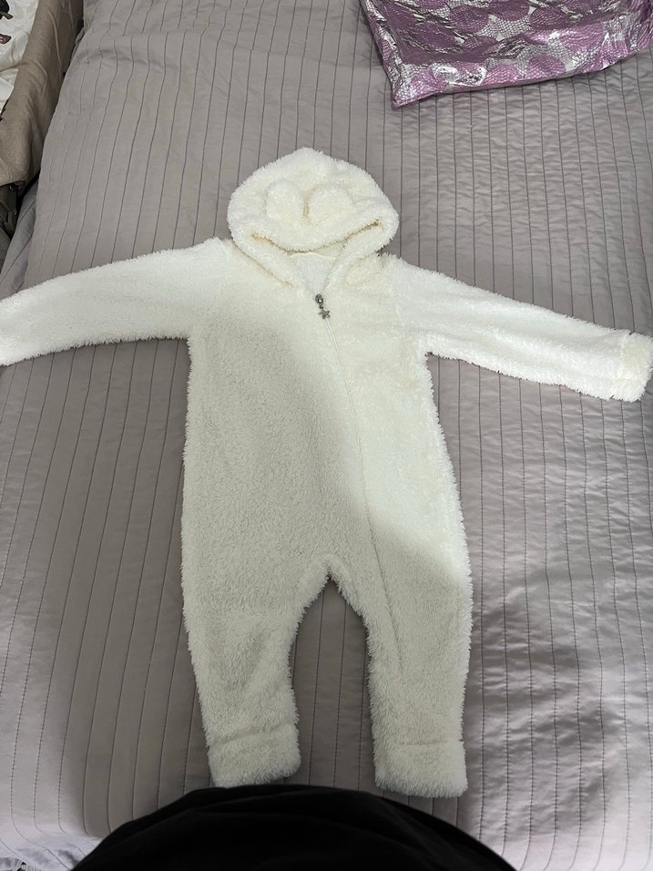 Kapüşonlu ve kürk detaylı, yumuşak beyaz bebek tulumu. Düz deseniyle rahat ve sıcak tutar. Soğuk günler için uygundur. ❄️