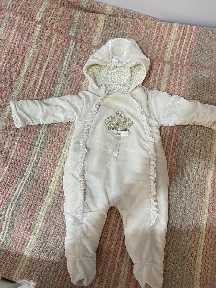 Kapüşonlu beyaz bebek tulumu, yumuşak kürk detaylı astronot yakasında hafif leke var ama yıkayınca çıkar