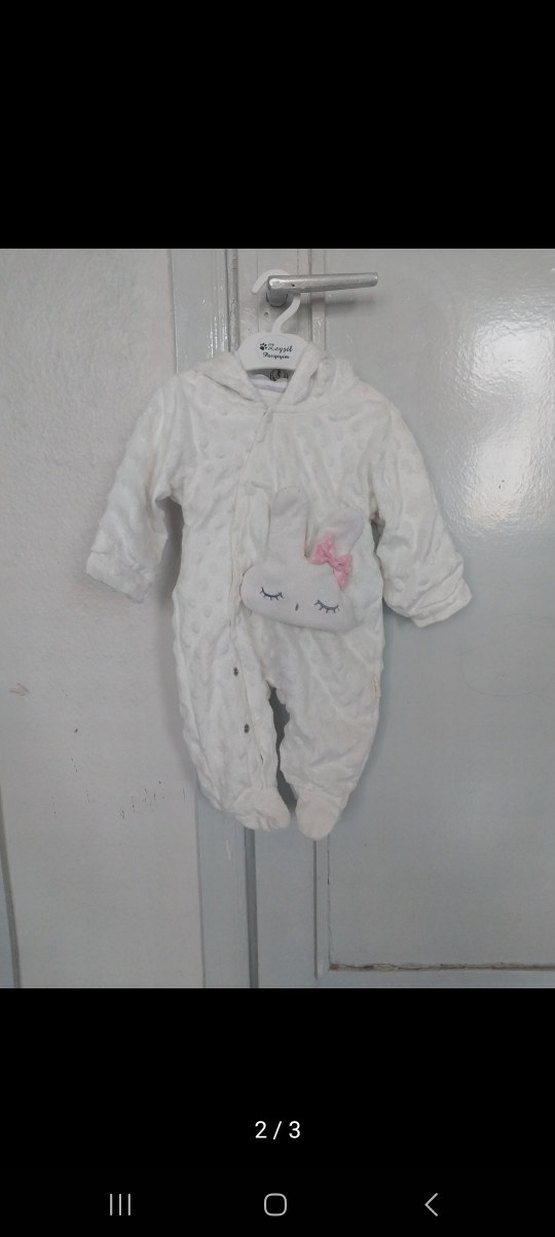 Kapüşonlu, kürklü beyaz bebek tulumu. Nakışlı desenleri ve pastel rengiyle bebeğinizi sıcak tutar.