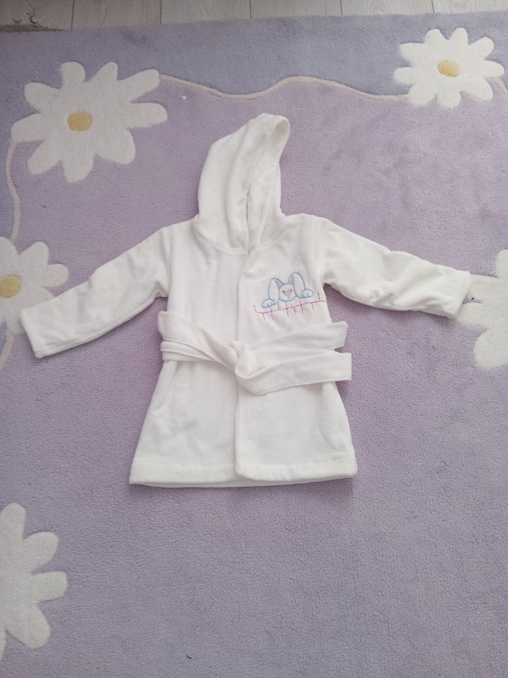 Kapüşonlu, yumuşak ve sıcak kumaştan yapılmış beyaz çocuk bornozu. Pastel tonlarda baskılı deseni ve kemeri vardır.