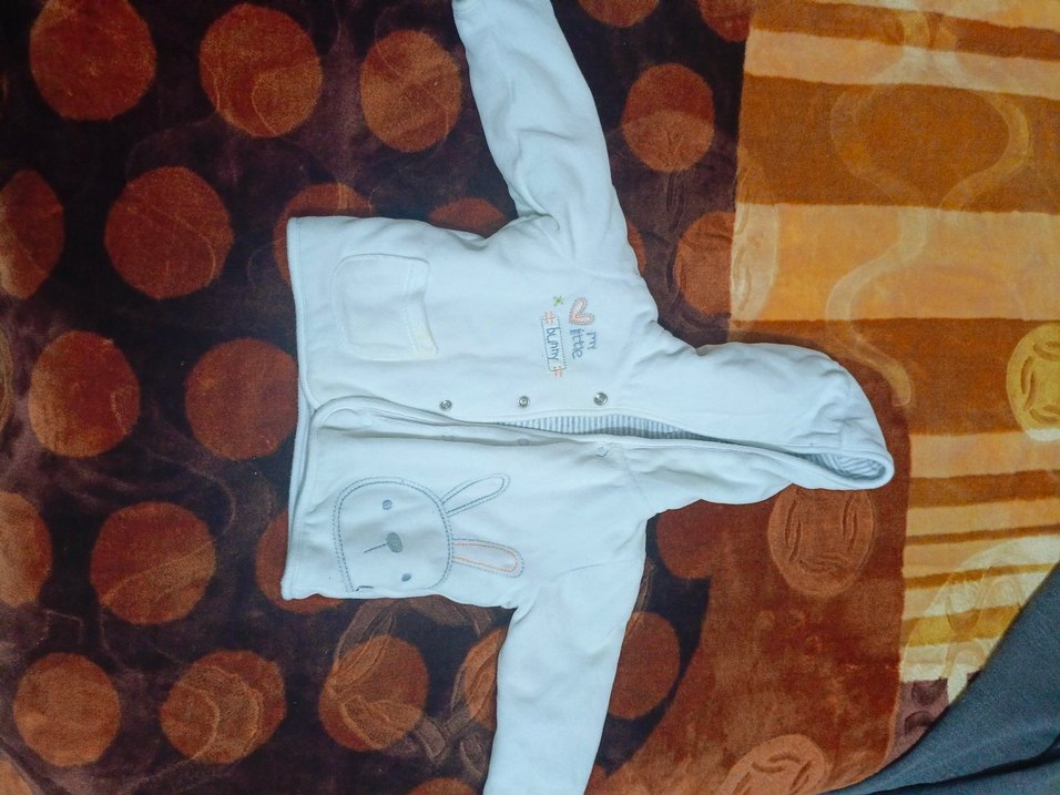 Kapüşonlu, düğmeli, baskılı desenli ve hafif beyaz renkte çocuk ceketi, yumuşak ve sıcak dokuda, rahat kesimle sunuluyor. bir iki yerinde hafif lekeler var ama fazla belli etmiyor