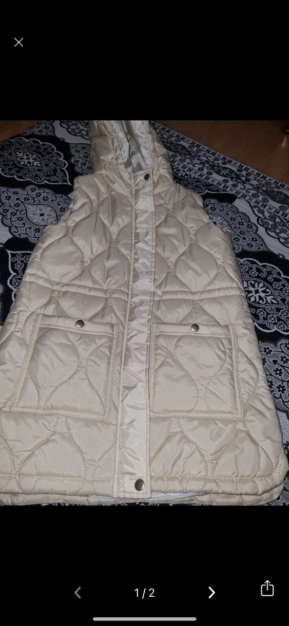 Kapüşonlu, ön cepli, uzun beyaz yelek. Rahat ve sıcak sentetik kumaştan, vücuda oturan kesimle günlük sokak stiline uygun.