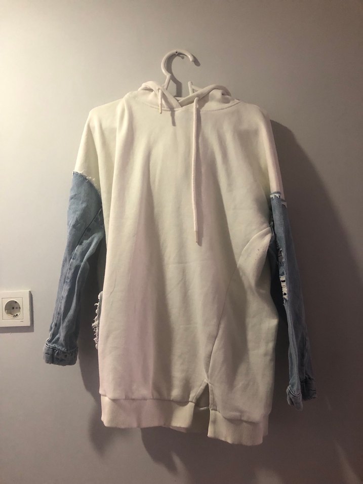 Kapüşonlu Beyaz Denim Kollu Sweatshirt