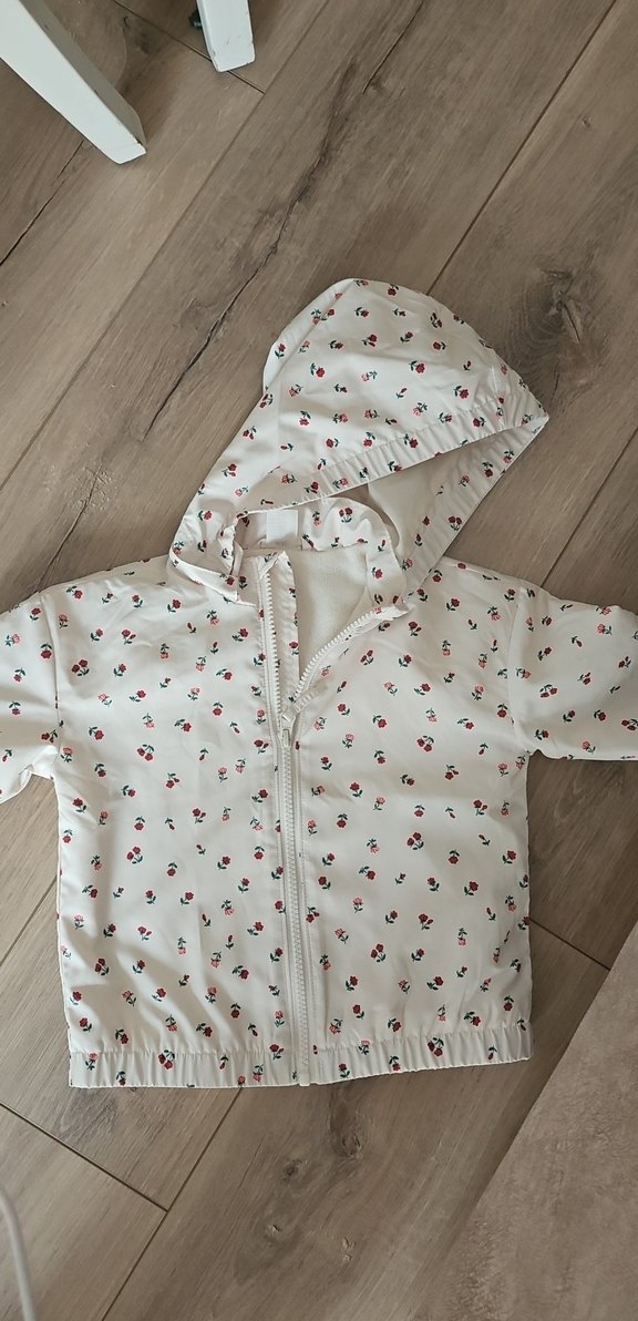 Kapüşonlu ve düğmeli beyaz, desenli kız yağmurluğu, bol kesim ve rahat bir tarza sahiptir. ️