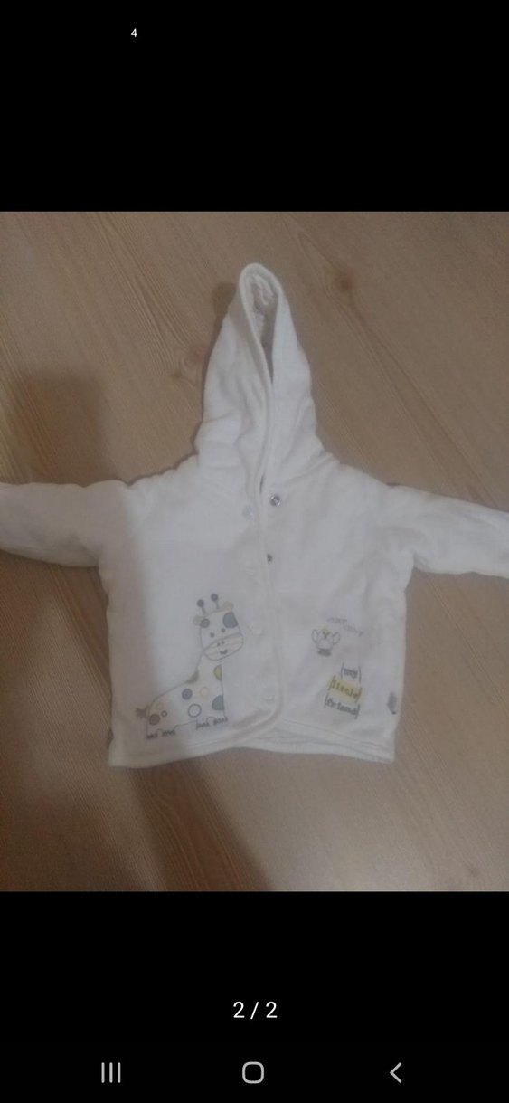 Kapüşonlu, düğmeli, hafif baskılı beyaz erkek çocuk ceketi, yumuşak ve sıcak kumaştan üretilmiştir. Street wear tarzına uygundur.