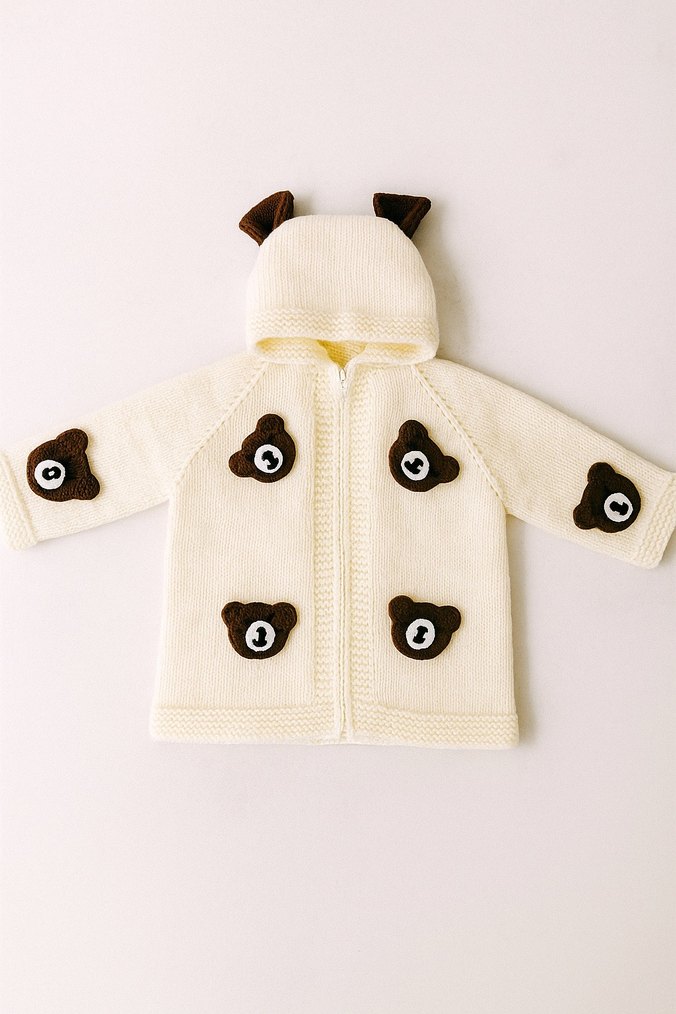 Kapüşonlu, uzun kollu beyaz örgü erkek çocuk hırka, renkli nakışlı ayı figürleriyle sokak tarzı.