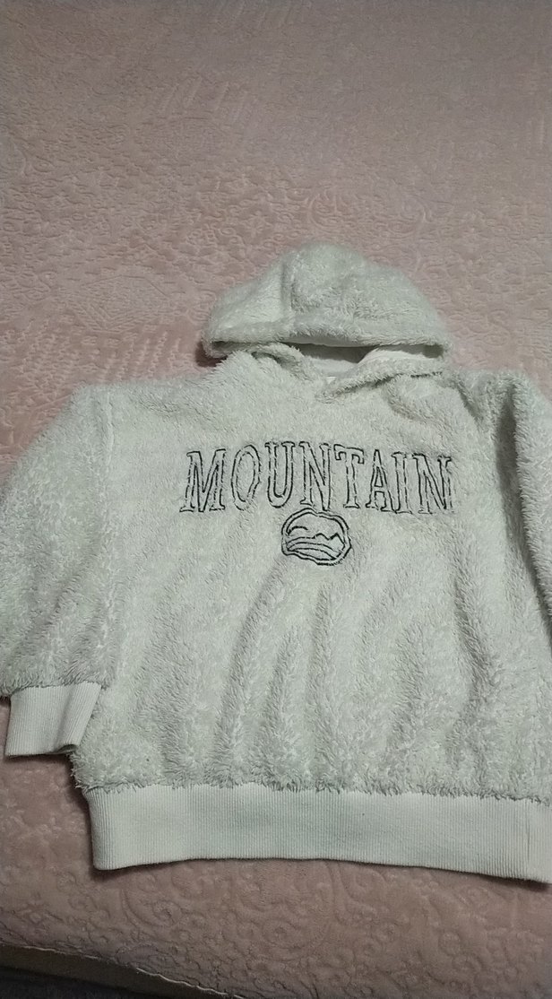 Beyaz kapüşonlu sweatshirt, yumuşak ve tüylü kumaşlıdır. Bol kesim ve uzun kolludur. Önünde 'MOUNTAIN' baskısı bulunur. Outdoor kullanıma uygundur. ️