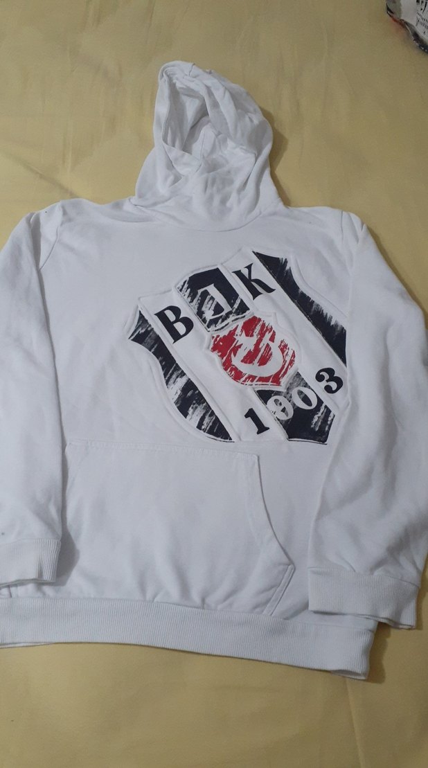 Kapüşonlu, uzun kollu, bol kesim beyaz erkek sweatshirt. Buton detaylı ve yumuşak kumaştan üretilmiştir. sadece nokta kadar bir lekesi var son resimde gösterdim.