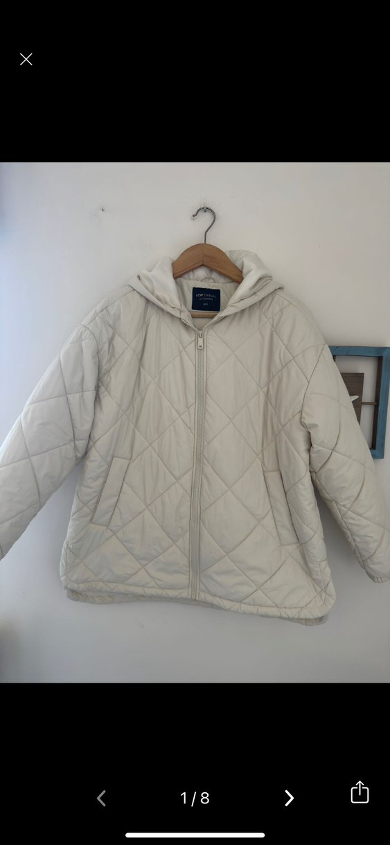 Kapüşonlu, uzun kollu ve fermuarlı kadın ceket. Beyaz renkte, rahat kesimli ve kapitone dokulu, günlük sokak stiline uygun rahat bir parça.