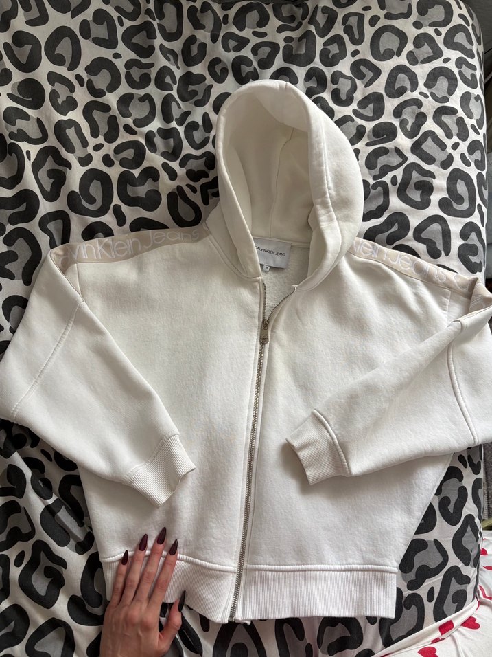 Yumuşak fleece kumaştan yapılmış, kapüşonlu ve fermuarlı beyaz sweatshirt, rahat oturan kesimi ve uzun kollarıyla günlük kullanım için uygundur.