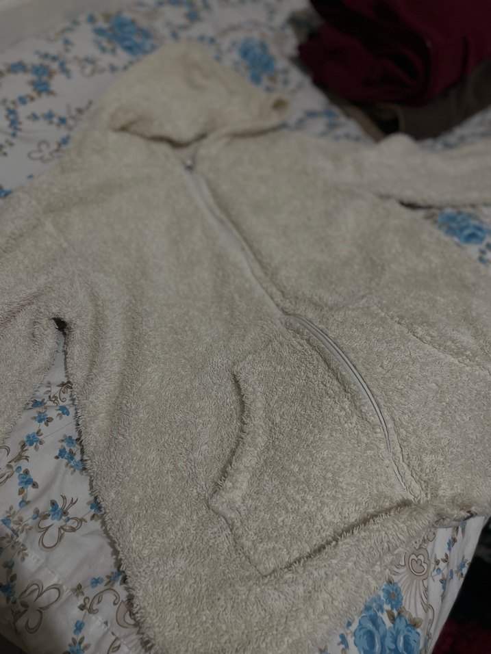Kapüşonlu ve uzun kollu, yumuşak kürk detaylı dokusu olan beyaz kadın peluş ceket. Rahat kesim ve midi boyda, günlük kullanım için uygundur.
