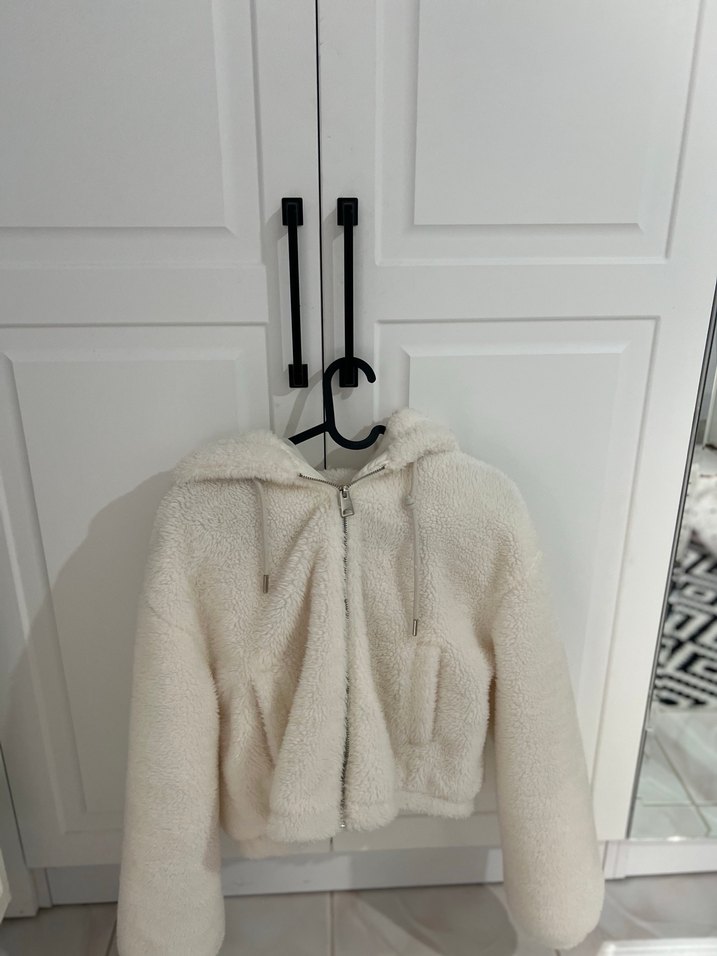 Bu beyaz, kapüşonlu ve uzun kollu kadın ceket, yumuşak ve sıcak kumaştan yapılmıştır. Normal midi uzunluğunda, kürk detaylı ve fermuarlı kapamaya sahiptir.