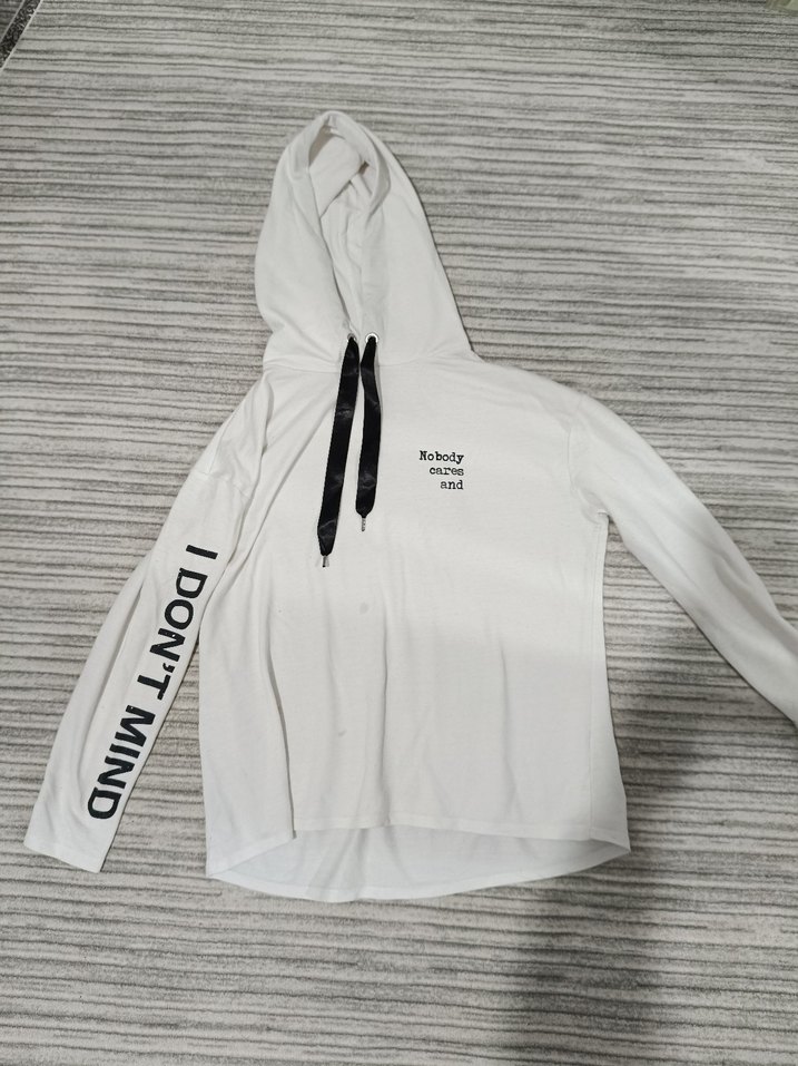 Beyaz kapüşonlu sweatshirt, uzun kollu ve rahat kesimdir. Yumuşak sentetik kumaştan üretilmiş, kol ve göğüste baskılı yazılar bulunur. Günlük kullanım için uygundur.