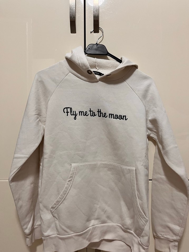 Yumuşak kumaştan yapılmış, kapüşonlu ve uzun kollu beyaz sweatshirt. Önünde "Fly me to the moon" yazısı ve cep detayı bulunur.