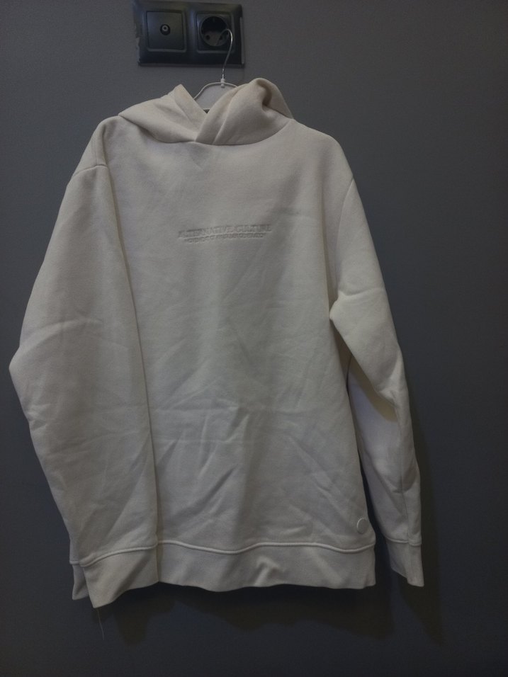 Kapüşonlu, uzun kollu, bol kesim beyaz sweatshirt. Yumuşak ve sıcak kumaştan, günlük kullanıma uygun sade tasarım.