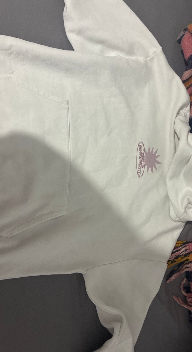 Kadınlar için kapüşonlu, uzun kollu ve bol kesim beyaz sweatshirt. Yumuşak ve sıcak kumaştan, baskılı ve fermuarlı, midi uzunlukta günlük rahat kullanım için uygun.