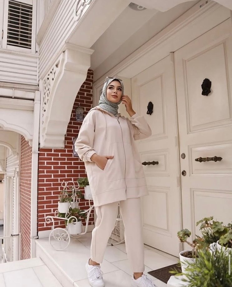 Beyaz pamuklu, kapüşonlu ve etnik desenli, bol kesim kadın takımı. Uzun kollu ve midi boyda, günlük rahatlık sağlar.