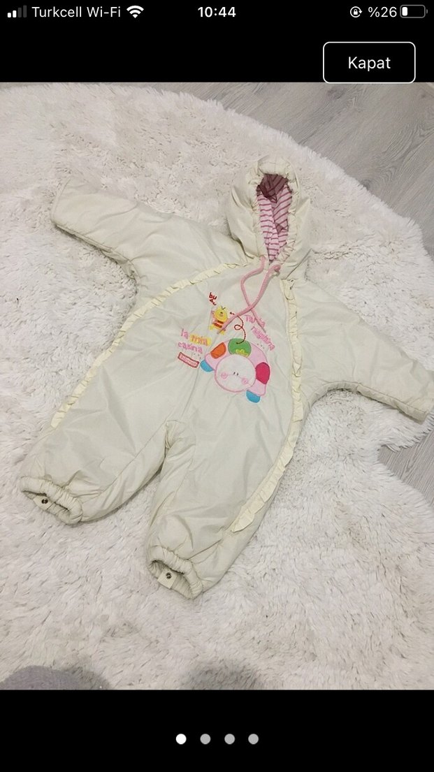 Kapüşonlu, kürklü detaylı beyaz kız bebek tulumu, renkli nakışlarla süslenmiştir. Soğuk havalar için sıcak tutar. ❄️