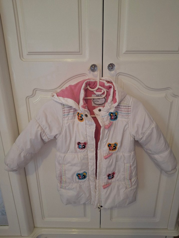 Kapüşonlu ve düğmeli, yumuşak ve sıcak dokulu beyaz kız çocuk montudur. Renkli nakış detaylarıyla bohem tarzı için uygundur.