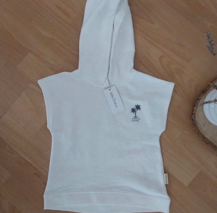 Kapüşonlu, kısa kollu, bol kesim beyaz kız çocuk panço. %100 pamuklu yumuşak ve sıcak kumaştan, küçük palmiye baskılı, rahat sokak stili için uygun.