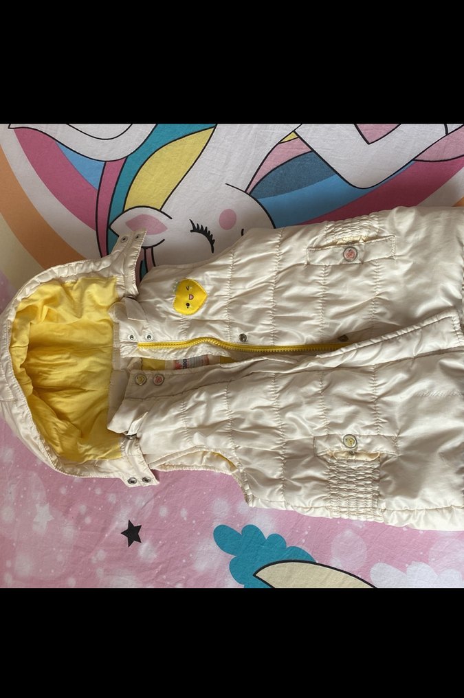 Kapüşonlu ve düğmeli, beyaz renkli, işlemeli detaylara sahip, sentetik kumaştan yapılmış, pastel sarı iç astarlı, fitted kesim kız yeleği. Kolsuz ve günlük şık tarzda.hüçbir deformasyonu yoktur.