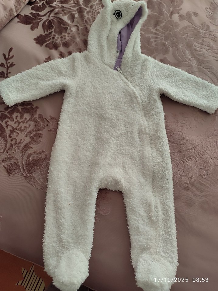 Kapüşonlu, kürk detaylı beyaz bebek tulumu, yumuşak ve sıcak kumaştan, desensiz ve gri tonlarda, soğuk havalar için uygundur. ❄️