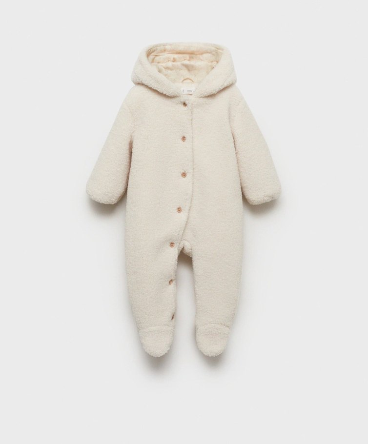 Bu beyaz bebek tulumu kapüşonlu ve yumuşak kürk detaylarına sahiptir, sıcaklık ve konfor sağlar. Pastel renkte ve desensizdir. ❄️