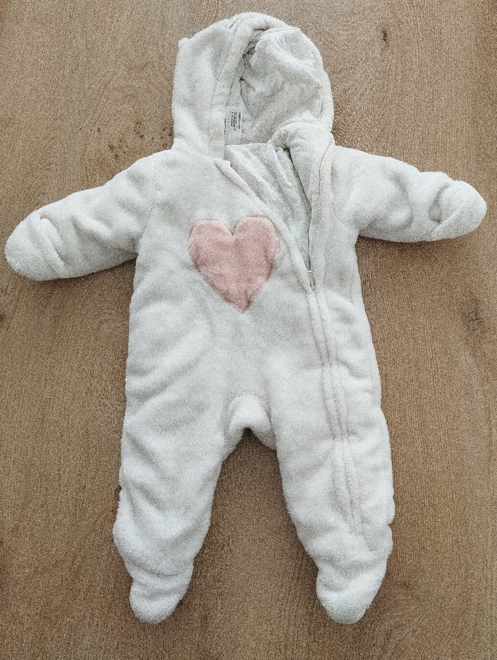 Kapüşonlu, beyaz kürklü, önünde pembe kalp detaylı, desensiz yumuşak bebek tulumu. Sıcacık tutar. ❄️