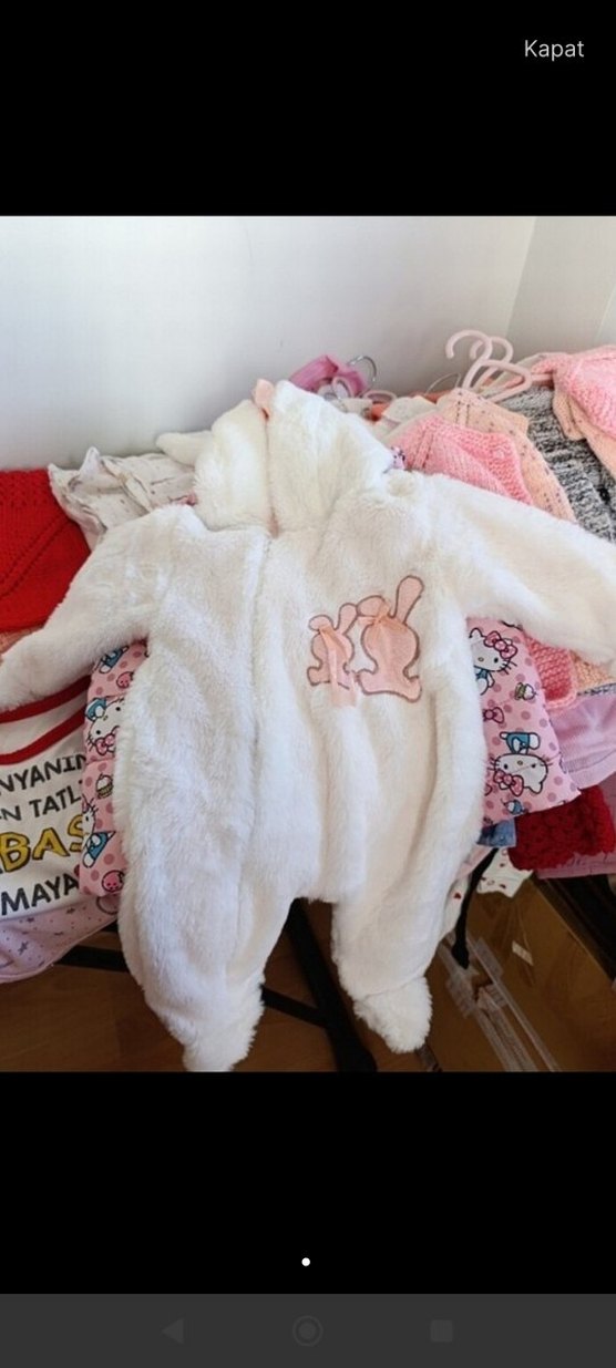 Kapüşonlu, yumuşak kürklü beyaz bebek tulumu. Önünde renkli nakışlı sevimli hayvan desenleri bulunur.