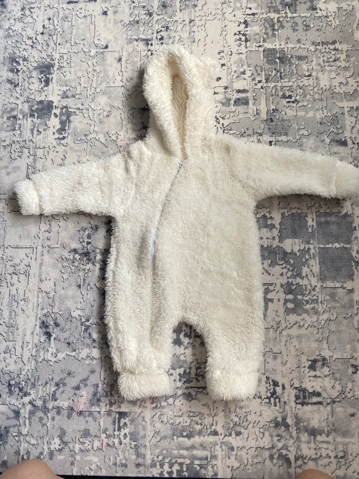 Kapüşonlu, yumuşak kürk detaylı beyaz bebek tulumu, küçükleri sıcak ve rahat tutar.