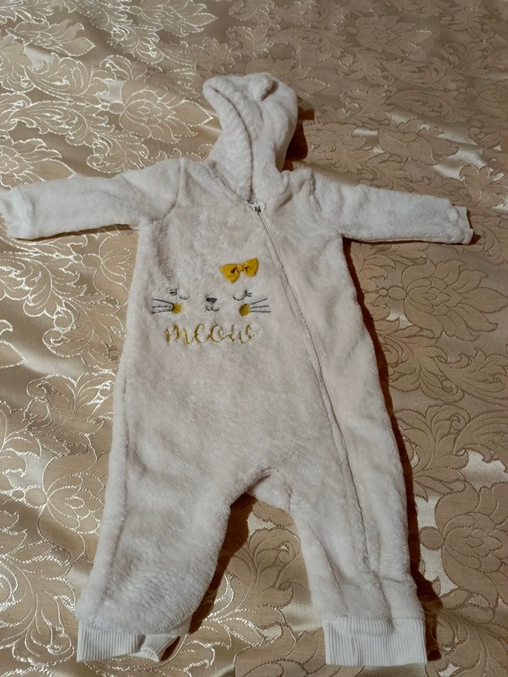 Kapüşonlu, yumuşak kürklü beyaz bebek tulumunda sarı fiyonk ve "meow" yazılı nakışlı kedi deseni bulunur.